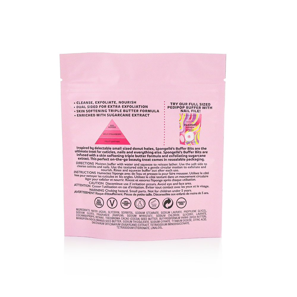 Our mini Buffer Bits in Bubblegum are a sweet extension of our skin-nourishing PediPOP! Buffers. This adorable, dual-sided buffer is the perfect size for precise deep-cleansing and softening of cuticles, nails, and small dry patches. It features special soft cleansing on one side and gentle textured exfoliation on the other. Infused with skin-softening triple butter and exfoliating sugarcane extract, you'll love the playful blend of red berries, wild strawberry, and fruit leather, leaving you feeling bubbly and light.