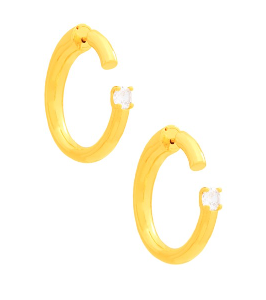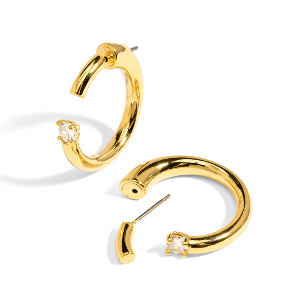 Hoop earring plated in 18K gold with a crystal adornment and front post closure.