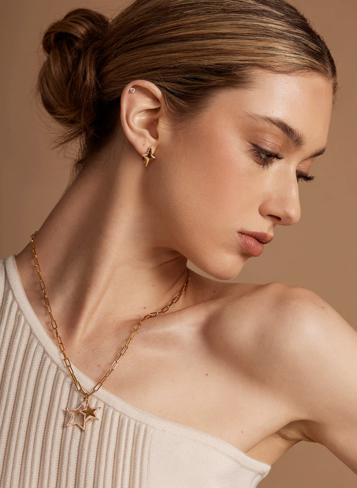 A dimensional gold star and a shimmering pavé-outline star hang together on a classic paperclip chain.