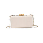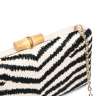 Bamboo-topped Dorit Evening Bag channels safari-chic with refined geometry. This box clutch features a textured, animal-inspired weave, a secure bamboo clasp and a gleaming chain strap that tucks away or removes for hand carry. Structured frame holds phone, cards and keys; lined interior keeps essentials organized. Thoughtfully designed with ethical sensibilities, it adds modern polish and bold pattern play to evening looks.