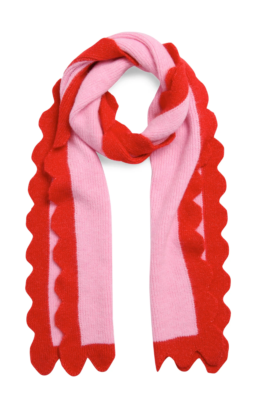 Wrap yourself in cozy style with the Melody Scarf, featuring the same scalloped charm and playful colorblocking. This oversized knit scarf is made for bundling up in serious comfort while still turning heads. The soft, warm texture and bold trim make it a standout piece for winter layering. Whether you're braving the cold or accessorizing a laid-back look, this scarf adds instant flair.