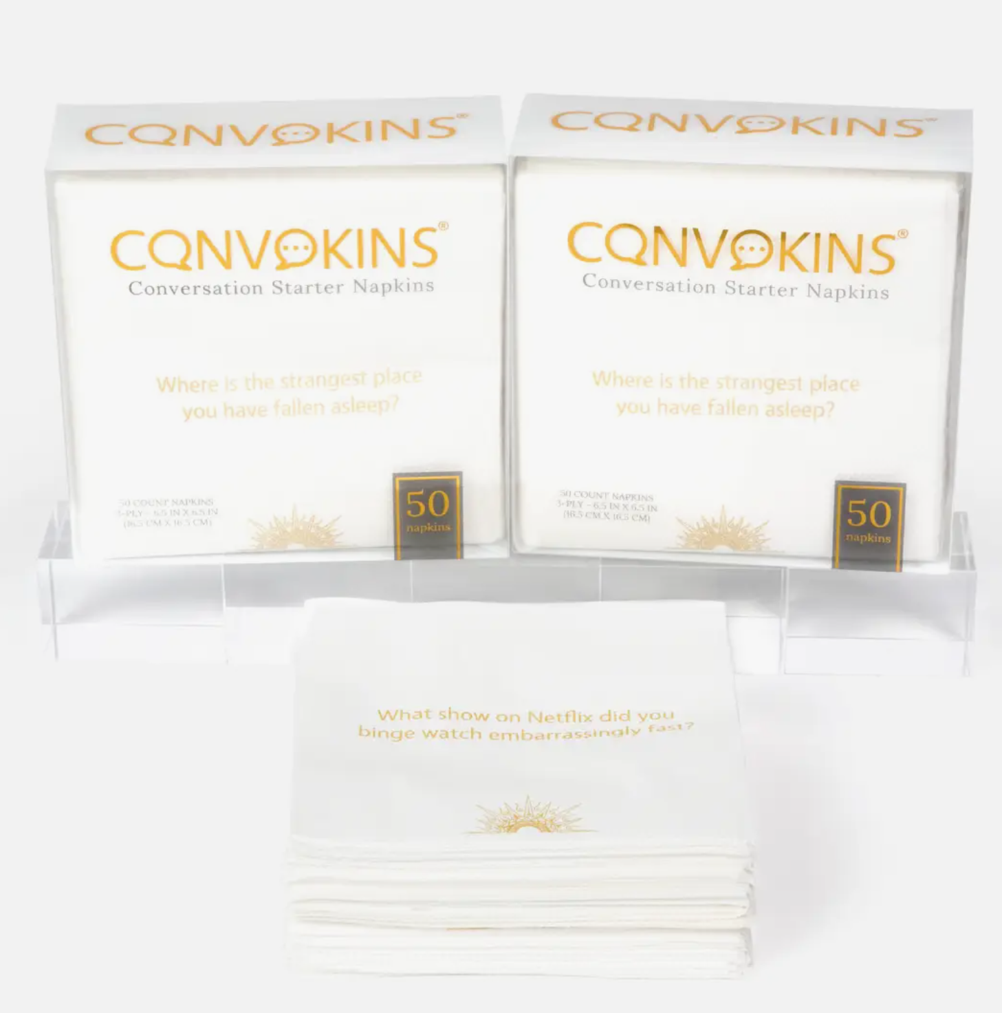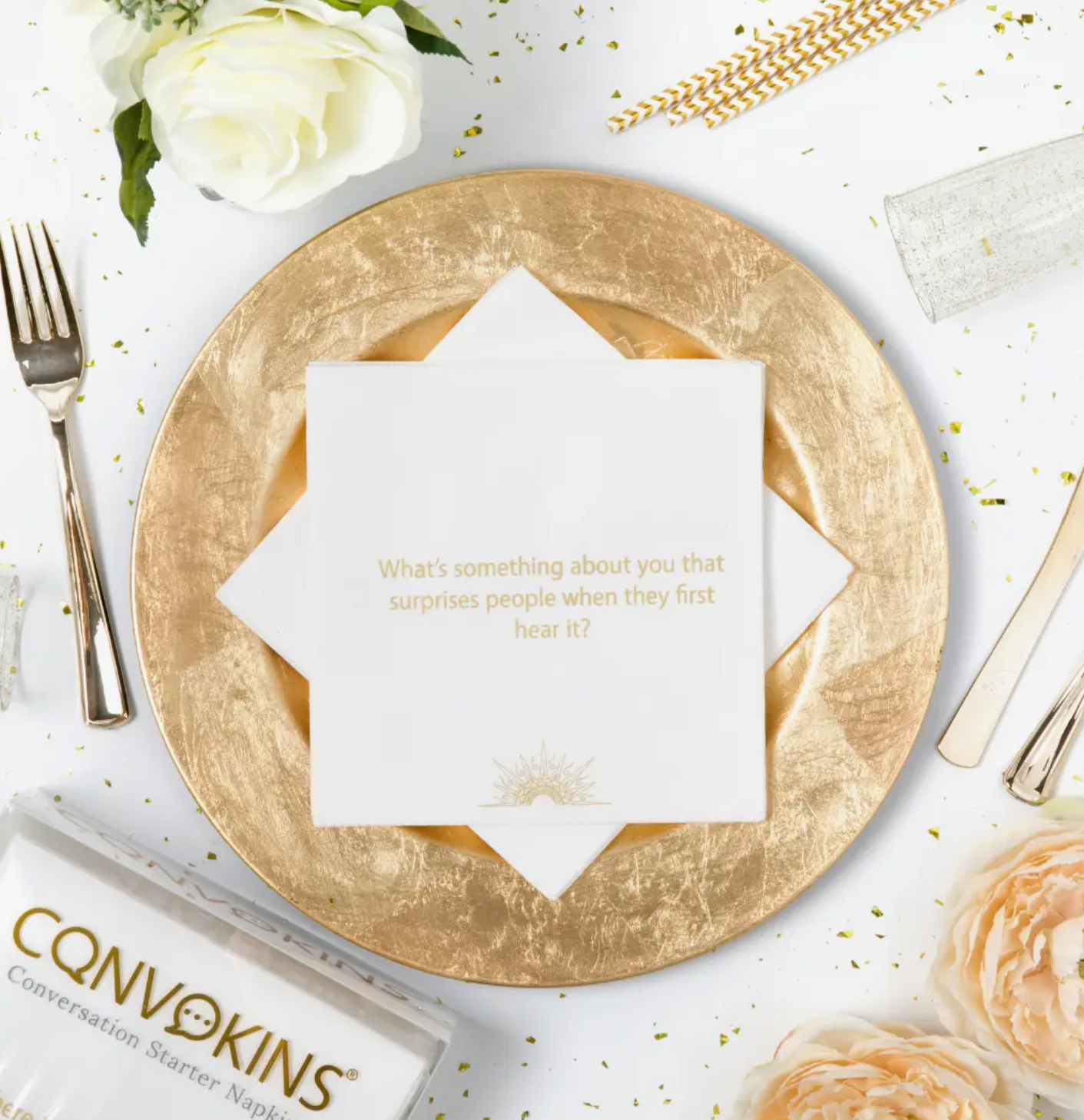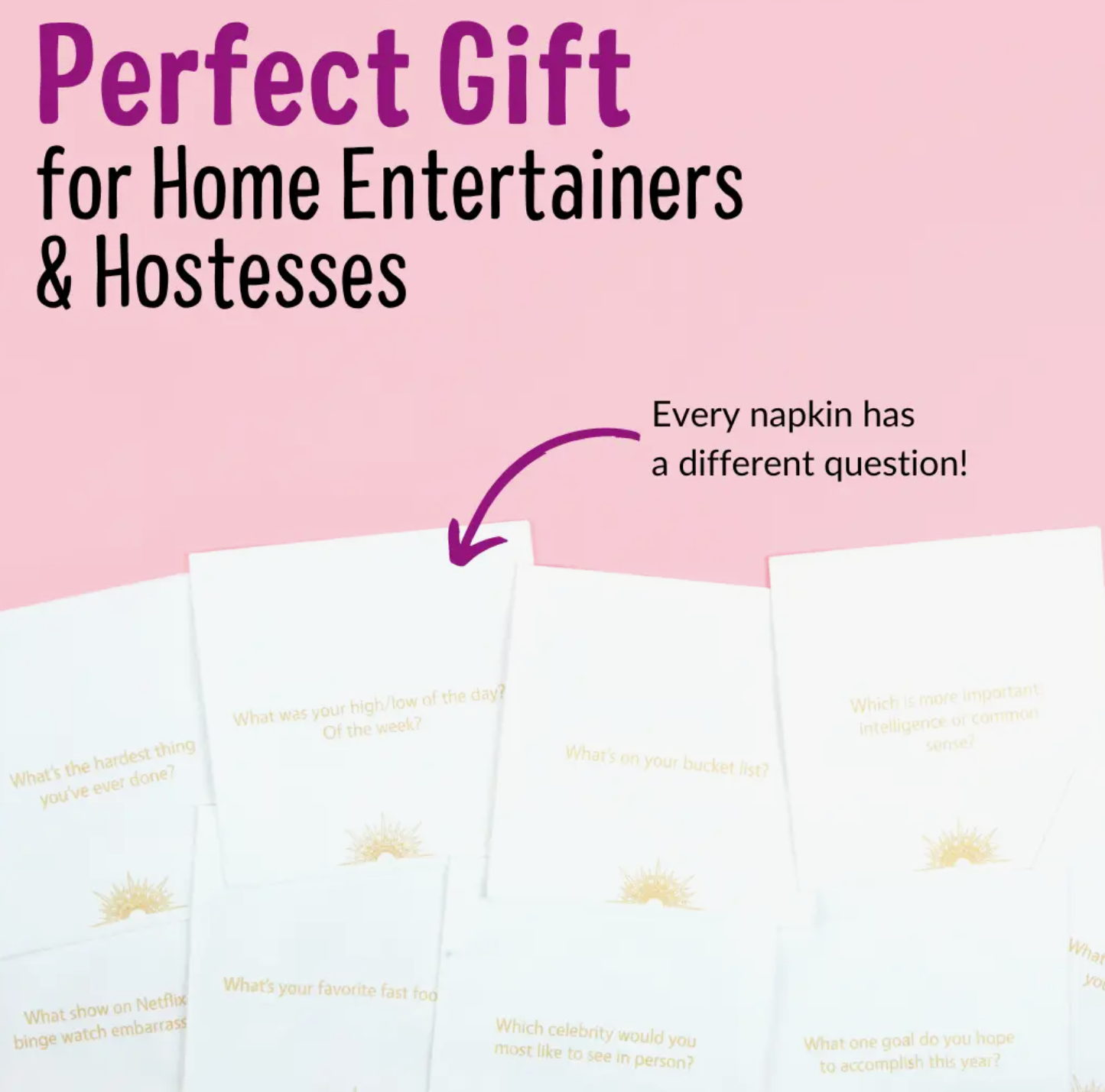 If you're looking for a unique gift item for your entertaining then this is it! Introducing the world's first conversation starter napkins! Napkins are set in embossed gold and have different conversation topic to spice up your next gathering.