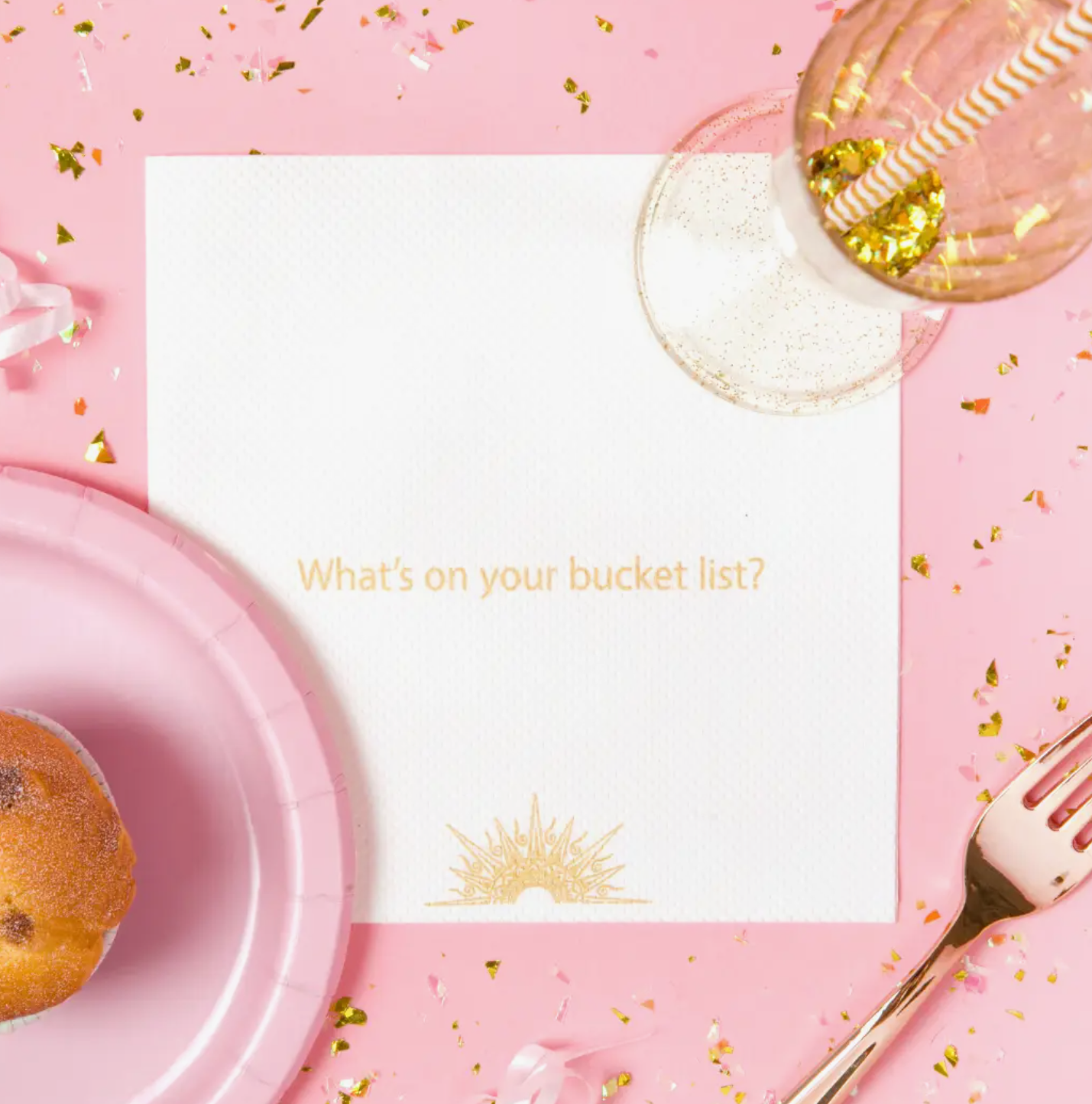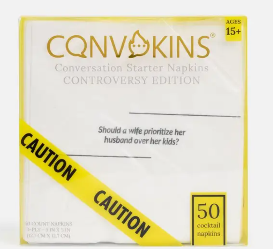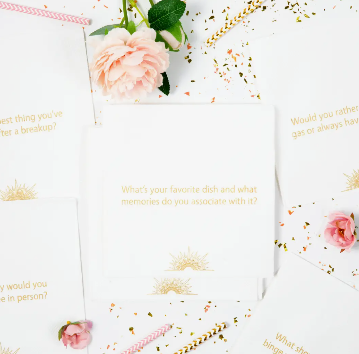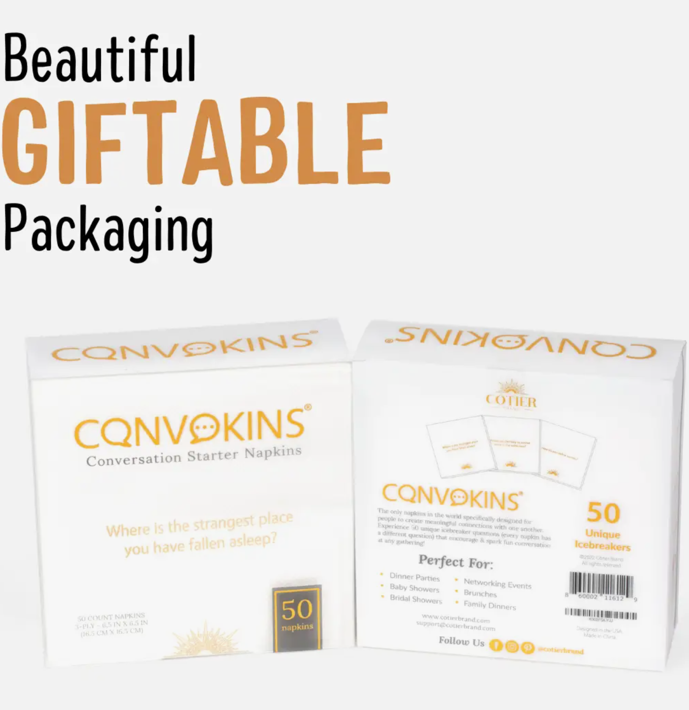 If you're looking for a unique gift item for your entertaining then this is it! Introducing the world's first conversation starter napkins! Napkins are set in embossed gold and have different conversation topic to spice up your next gathering.