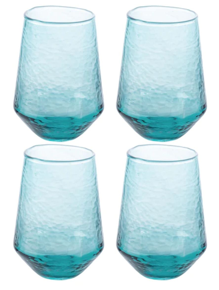 These Glass Tumblers are a modern and fresh addition to any stemware collection. Designed with a sophisticated hammered glass finish that provides a textured feel and beautifully visual effect and a chic sloped base, these tumblers are sure to add a modern touch to any dining occasion. Due to the artisan nature of these products each item will be uniquely different.