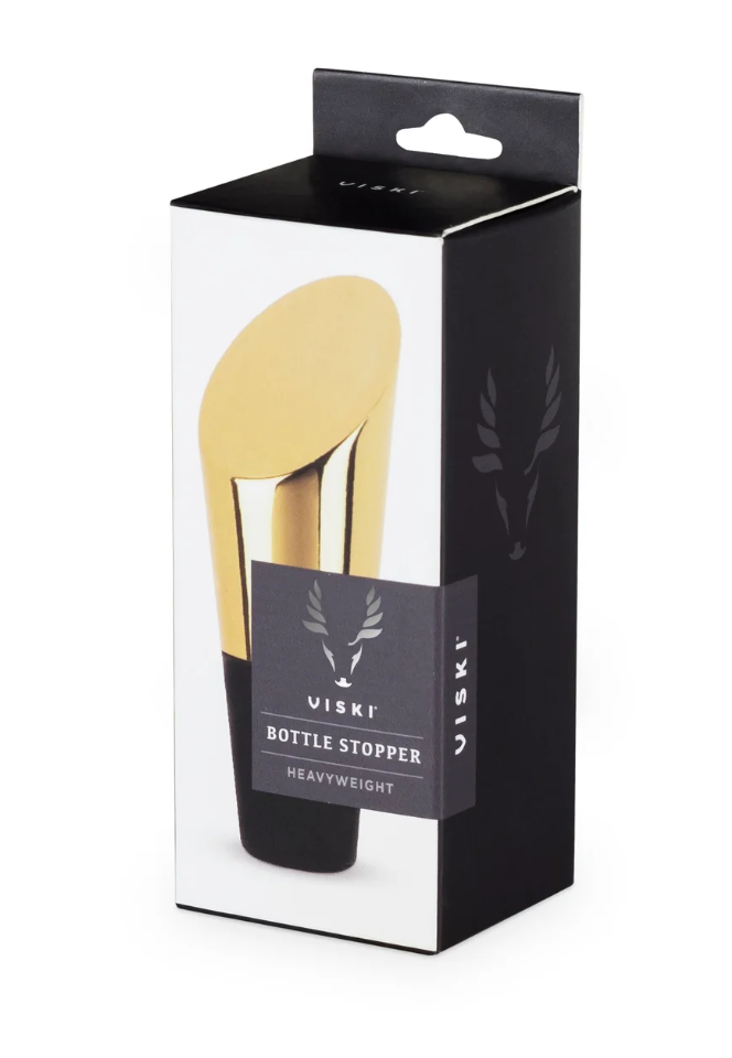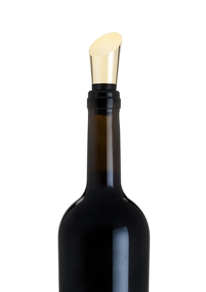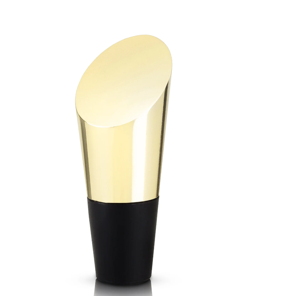 Eye-catching gold with a smooth silicone sleeve puts our heavyweight bottle stopper in center stage. Simple in design, the slanted crown and polished metal suggest an opulence that transcends the average wine accessory.