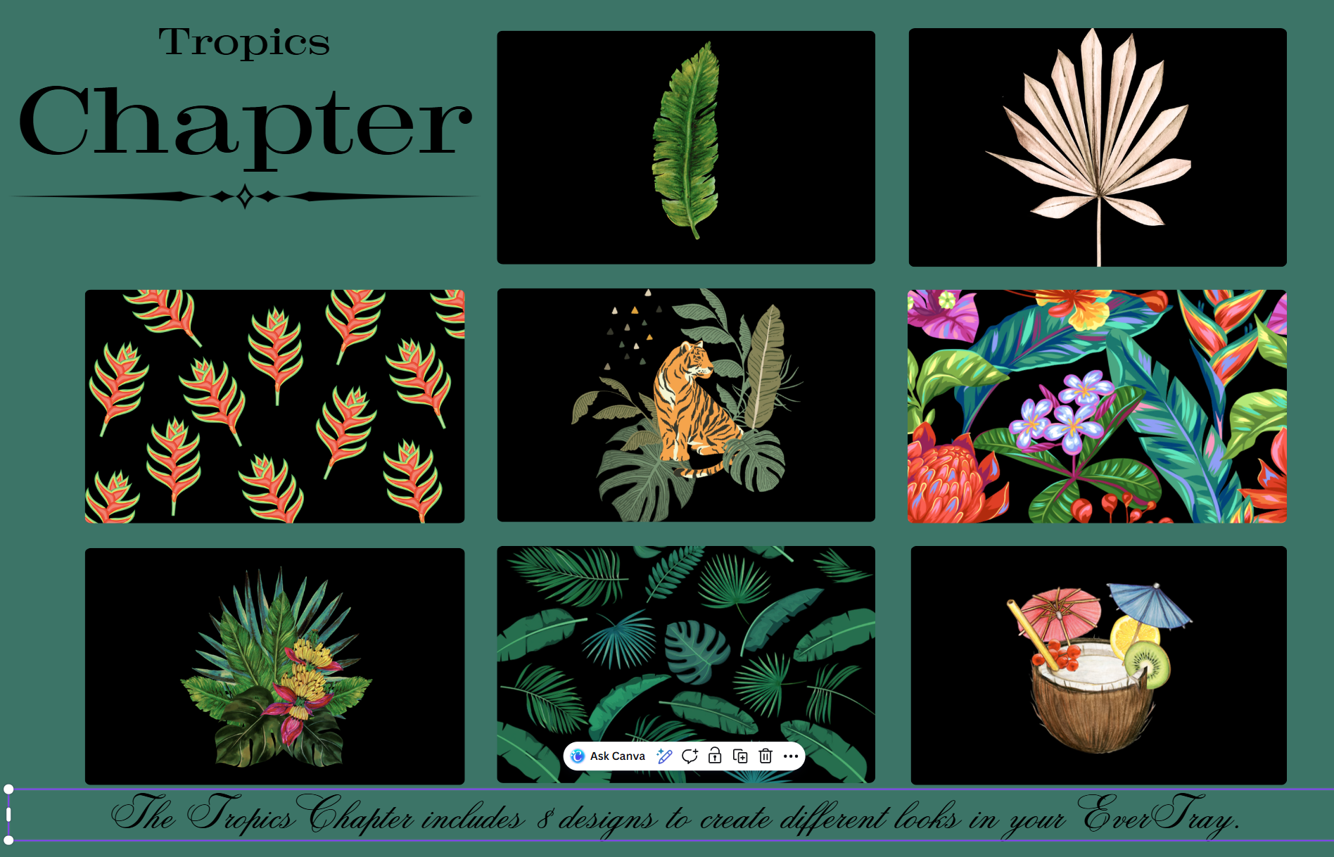 Each Evertray Chapter includes 8 designs  exclusively created for the EverTray (sold separately).  Have fun changing out the inserts to reflect the current season, mood or party!