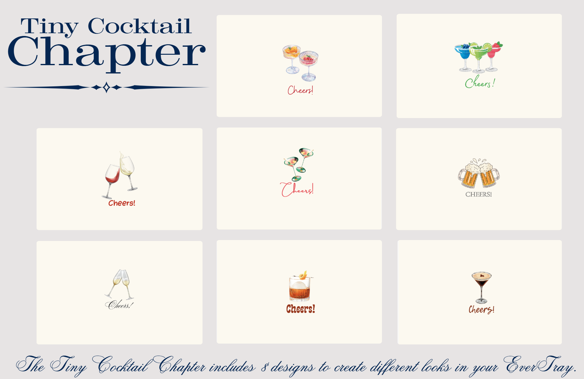 Each Evertray Chapter includes 8 designs exclusively created for the EverTray (sold separately).  Have fun changing out the inserts to reflect the current season, mood or party!