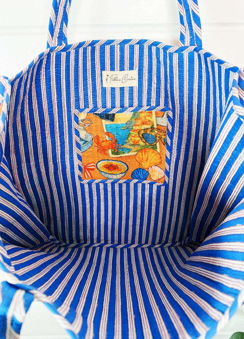 Explore the perfect blend of style and function with our Handmade Blue Italian Getaway Tote Bag. Oversized quilted tote with vivid, eye-catching print. Reversible with interior pocket, 100% cotton, artisan-made sustainably in small batches - perfect for beach, travel, boutique displays. Features & Details: • Oversized quilted tote bag (17.5" x 17.5") • Reversible design with contrasting interior fabric • Interior pocket for convenient storage • Constructed with 100% cotton, quilted hand printed fabric