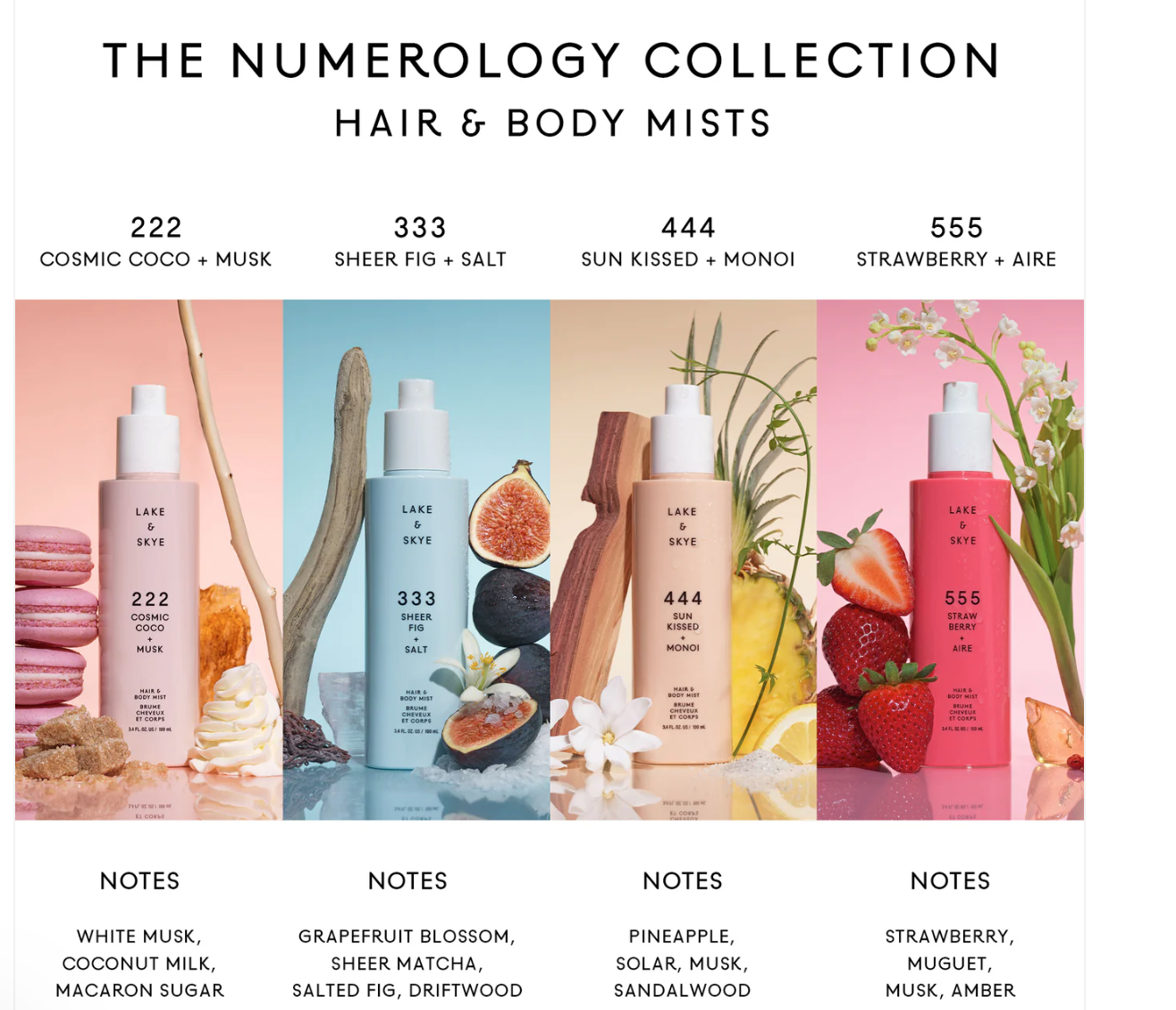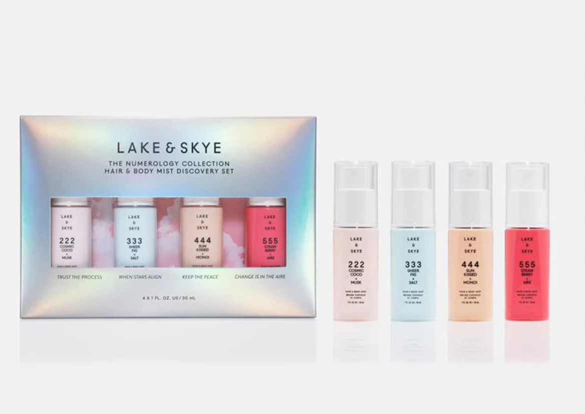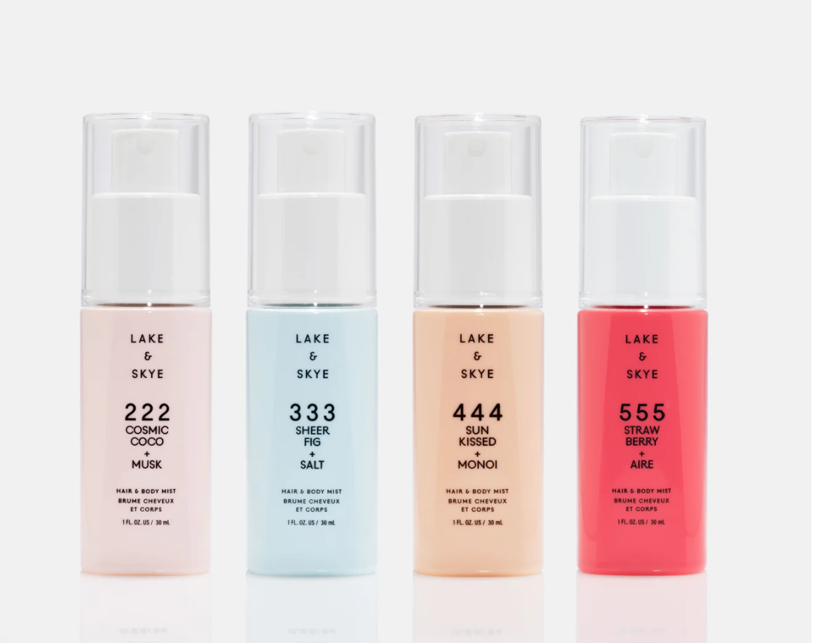 Numbers have energy- just like you. In numerology, repeating numbers are little signals from the universe, reminding you that you’re on the right path. Inspired by this idea, the Lake & Skye Hair & Body Mists are designed to help you step into your best self through scent.