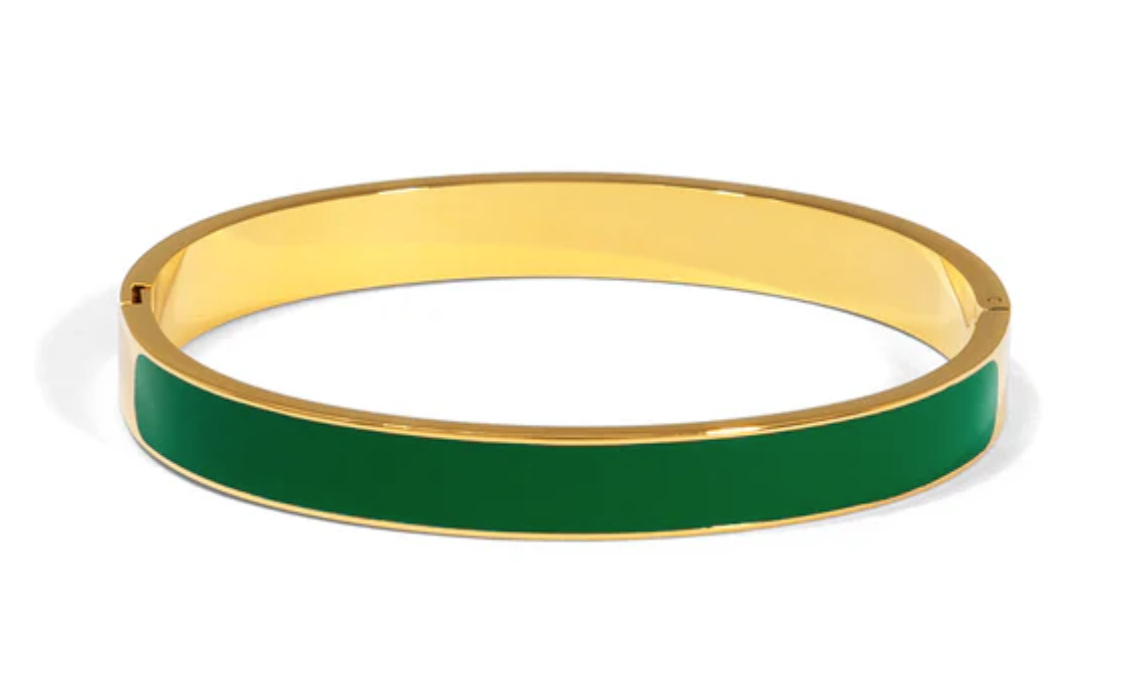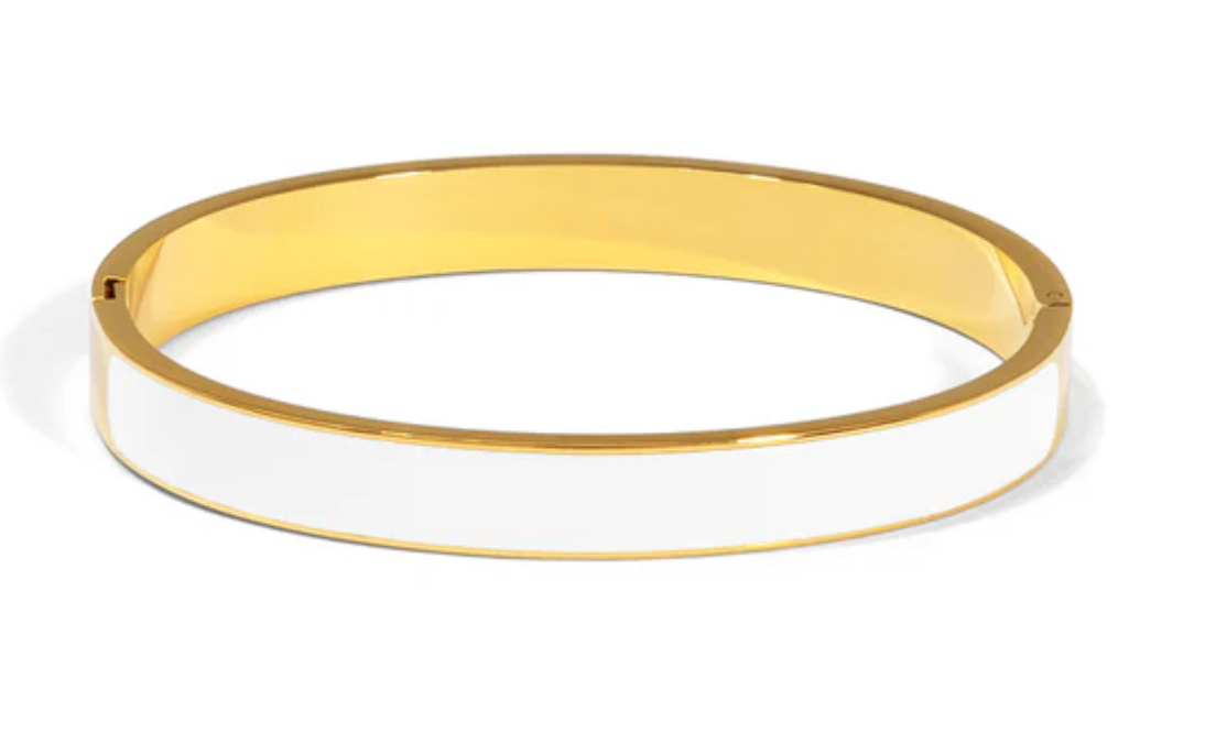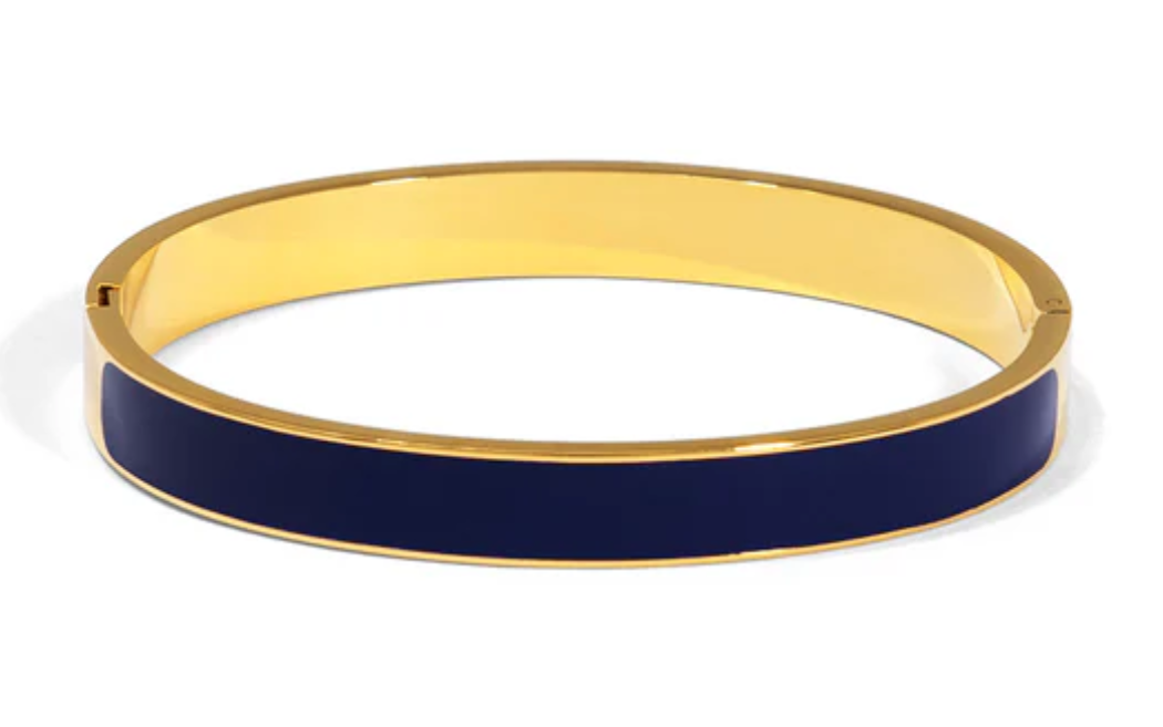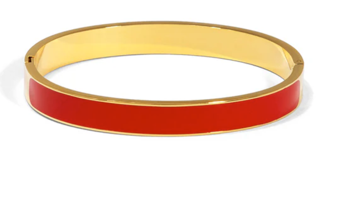 Stainless steel bangle featuring a polished enamel finish in a vibrant assortment of colors, framed by a gold-tone edge for a hint of luxury. Perfect for stacking or wearing solo. Water-proof and sweat-proof. Pair with Flower Enamel and Nadine Bracelets!