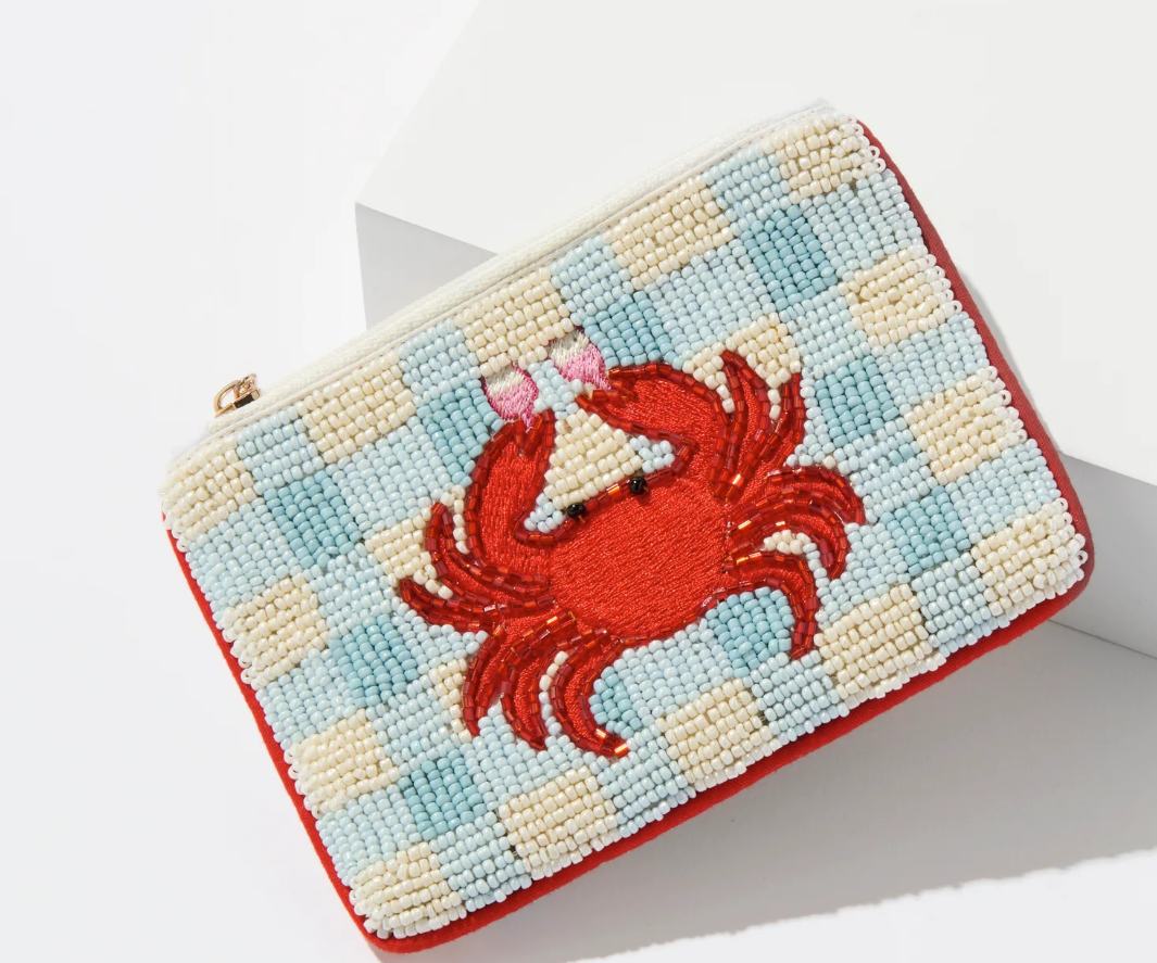 The Riviera Beaded Coin Pouch brings coastal charm and playful personality to your everyday essentials. Featuring a vibrant red crab toasting with two glasses of rosé, this cheeky design is full of vacation vibes. The soft blue and cream checkered background adds a breezy touch, while the bold red backing keeps it fun and eye-catching. Finished with a secure top zip closure, this compact pouch is perfect for coins, cards, or your favorite mini must-haves.
