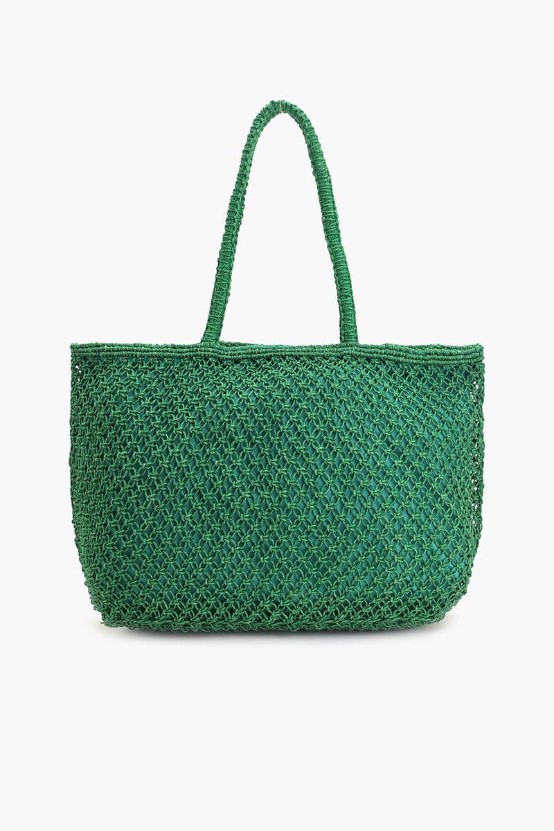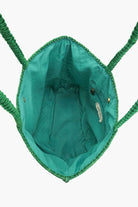 - This large tote bag is handwoven from green raffia material, offering a natural and textured look.