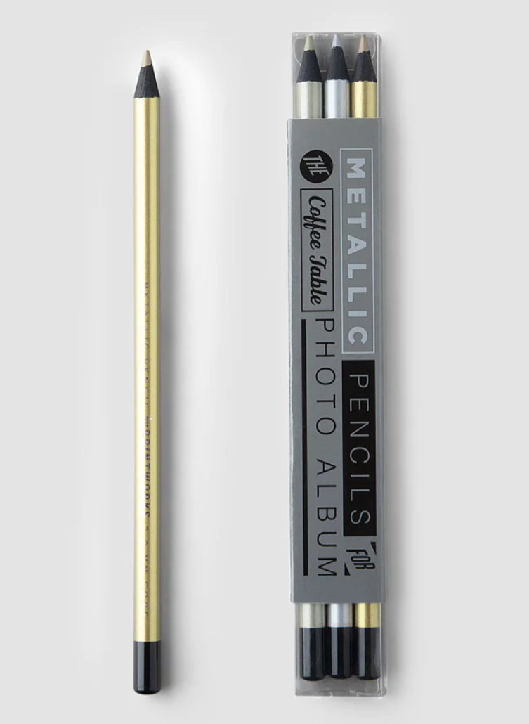 Discover our 3-pack of metallic pencils in colors gold, silver, and champagne designed for writing in our photo album. These pencils feature a soft 3/32 inch core, ensuring a smooth writing experience. Crafted from linden wood, they provide persistence and quality, enhancing your photo album experience.