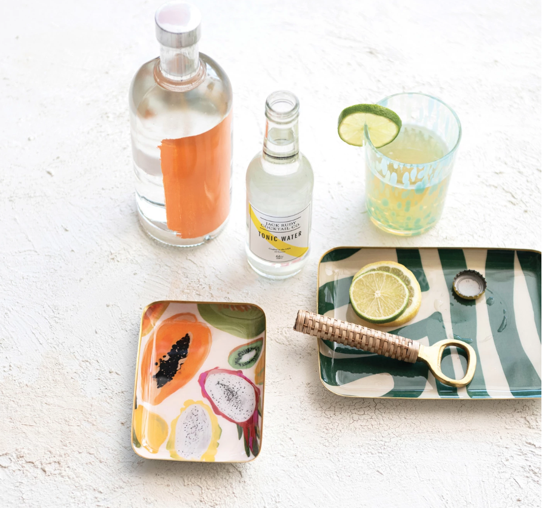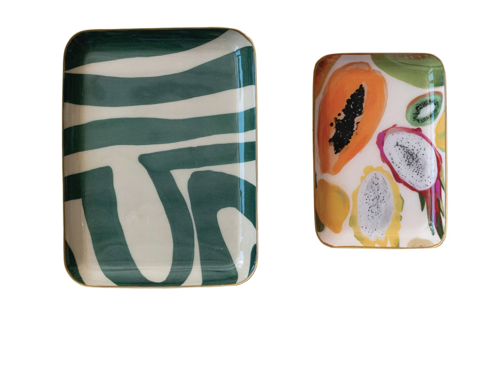 This set of two metal trays features enameled designs, enhancing any space. The smaller tray features a fruit motif in a variety of colors such as yellow, green, pink, and cream, while the larger tray features an abstract geometric pattern in green, white, and cream. The trays are rectangular with curved edges and are made of sturdy metal with a smooth enamel finish. They add a cozy and cheerful vibe to any home. This is a beautiful and fun piece that will add beauty and freshness to the table and kitchen serving.