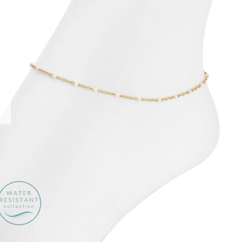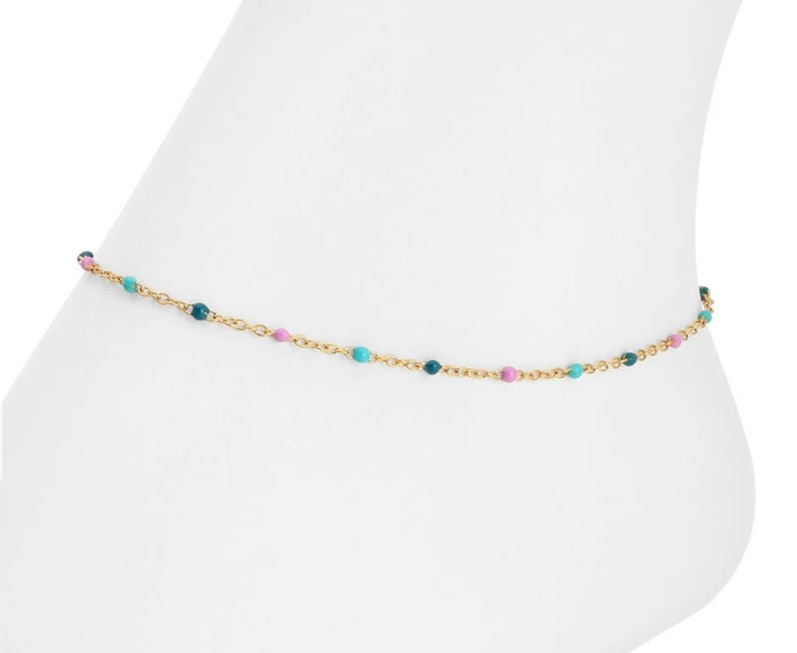 Delicate and effortlessly chic, the Sweetly Colored Delicate Chain Anklet adds a subtle pop of color to your everyday look. Crafted from stainless steel with 18K gold plating, this water resistant anklet features a fine chain accented with dainty colored beads for a light, feminine finish. Designed for all day wear, it offers lasting shine and comfort whether you’re at the beach, pool, or out on the town. Available in six beautiful color options, this gold chain anklet is perfect worn alone or layered for a personalized, modern style.