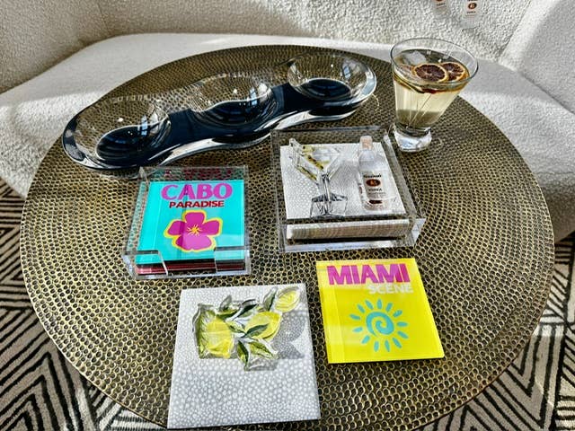 Add the Acrylic Coaster Holder to display a Set of 4.