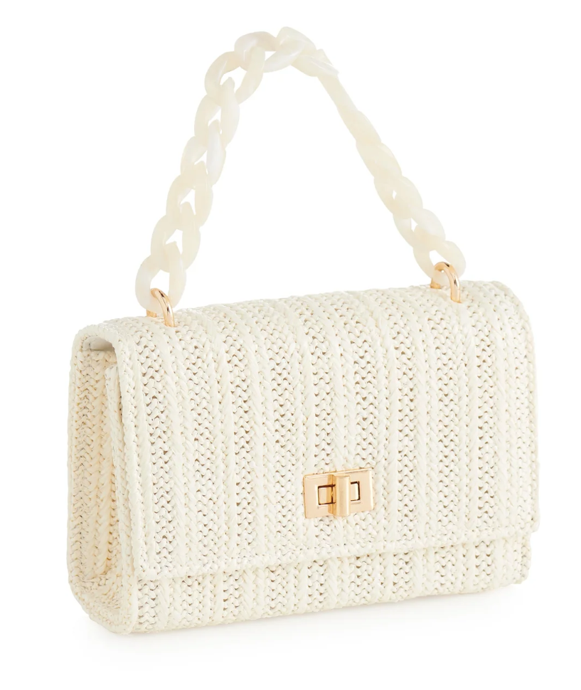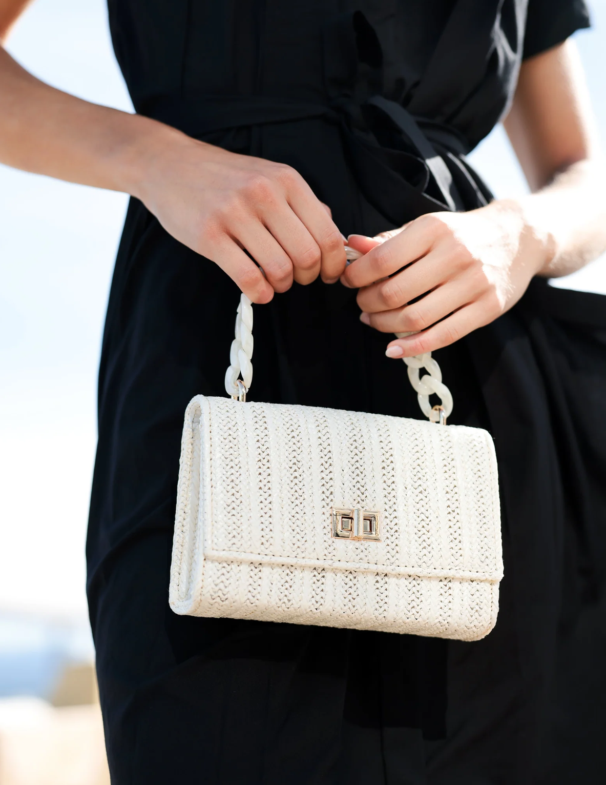 Meet the Marisol Mini Bag, your new go-to for effortlessly chic style! Woven to perfection with a chic raffia texture, this petite beauty features a structured silhouette, a twist-lock closure, and a luxe resin chain handle for that added touch of sophistication. Available in vibrant colors like turquoise, classic neutrals, and even a playful rainbow stripe, it’s perfect for brunch dates, evening events, or elevating your beach-day style. Compact yet spacious enough for your essentials—this bag is mini but mighty.