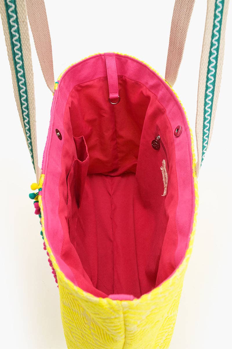 This has to be your new favorite tote! This vibrant, eye-catching bag is made from durable hatch-patterned yellow woven jacquard with bold "Amalfi" lettering, lemon yellow and bright pink details that’ll instantly brighten your day.