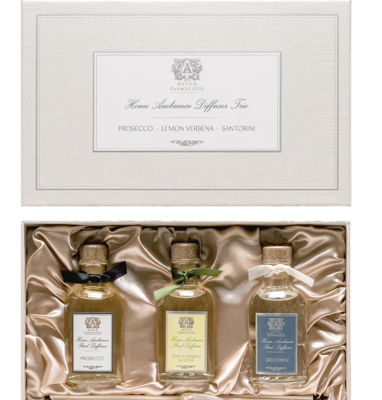 The Product: Featuring three 100ml Reed Diffusers in three of the top-selling scents: tart and invigorating Lemon Verbena, fresh and fizzy Prosecco and crisp, spicy Santorini. Give the gift of three indulgent, mood-elevating scents. Our Signature Diffuser Trio is packaged in an ivory croc-embossed box adorned with silver foiling.