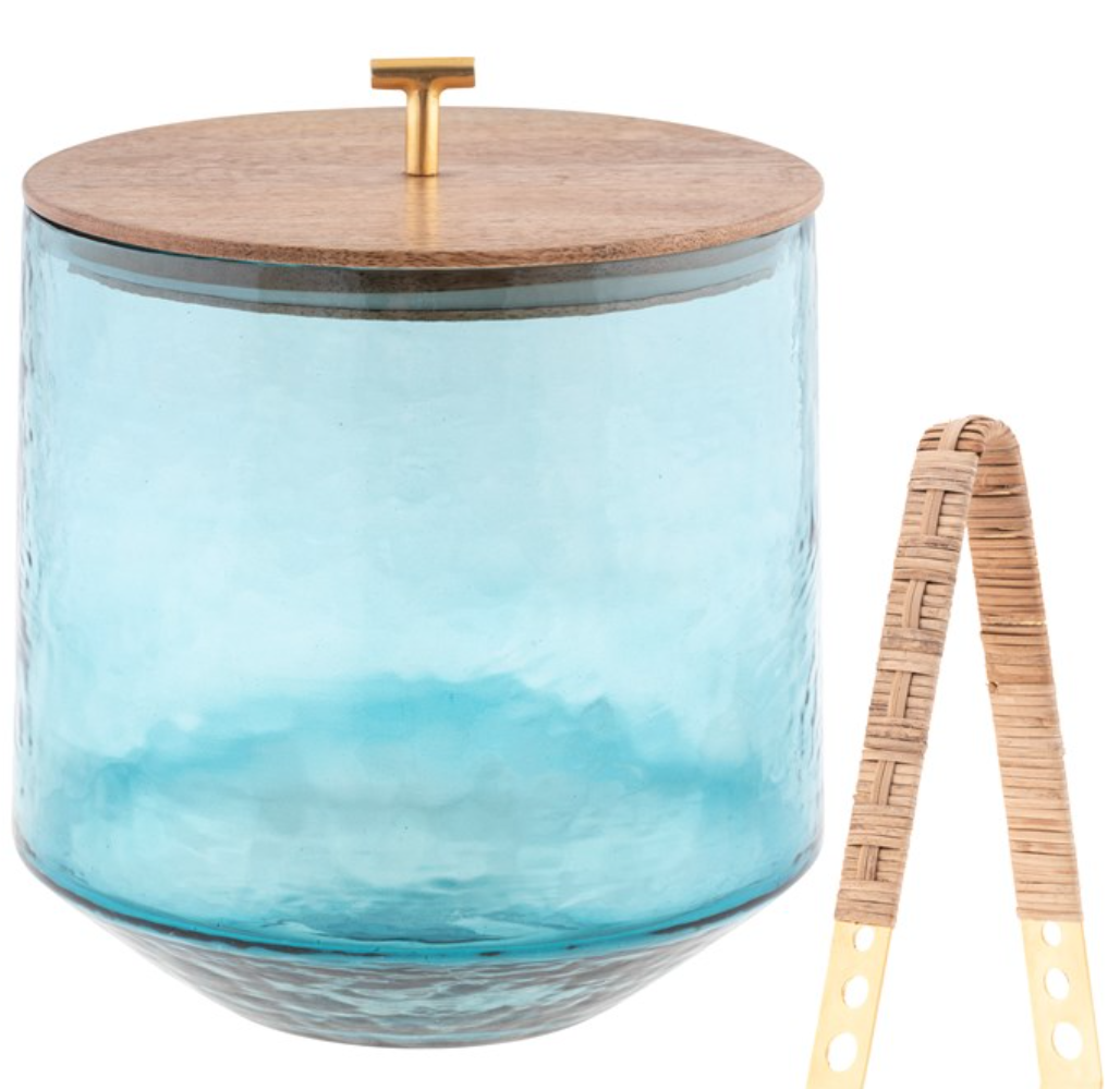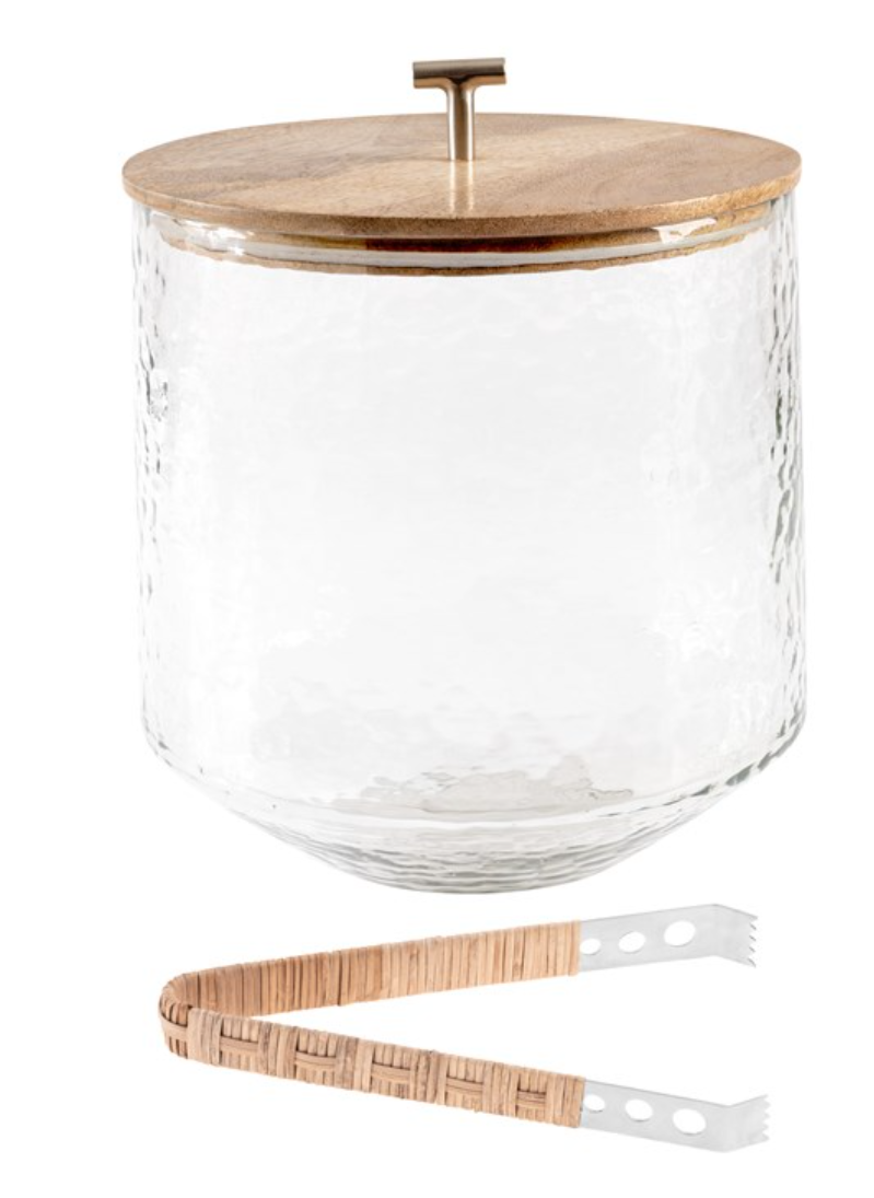 Complete your bar cart set up with our Catalina Ice Bucket. The wooden lid and brass handle keep contents protected from outside heat and raffia wrapped tongs make grabbing individual pieces of ice a breeze. Fill your glass with ice and pour your favorite cold beverage for a refreshing drink after a long day.