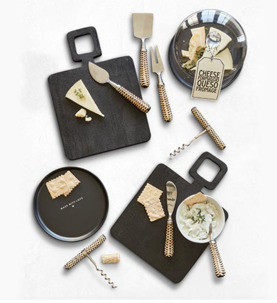 Small mango wood board with beautiful square handle and textured black finish will add style to any gathering. Use for cheeses and meats or any other appetizers at your next party.
