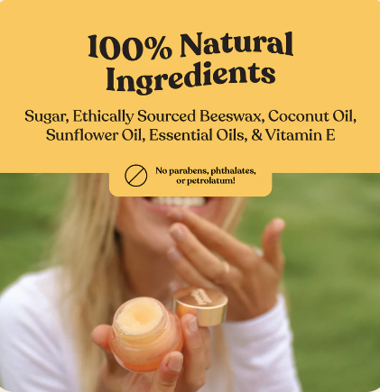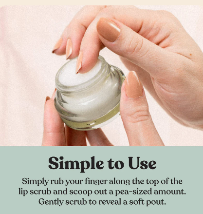 Rub finger over lip scrub and scoop out a pea-sized amount. Massage onto lips in a circular motion. Wipe off excess and reveal perfectly soft and hydrated lips!