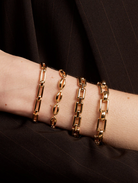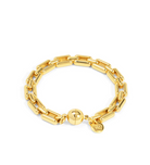 Stacked and sculptural. This stretch bracelet features repeating marquise forms in a glossy gold finish, echoing rhythm and shine.