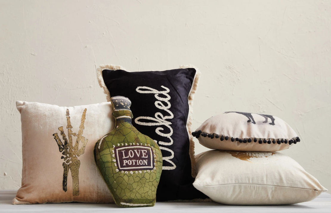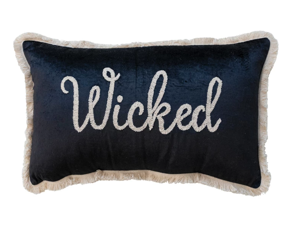 Elevate your Halloween decor selections with the Cotton Velvet Lumbar Pillow featuring exquisite embroidery and fringe details. The "Wicked" design in striking black and cream colors adds a touch of sophistication and drama to any living space. Measuring 24 inches in length and 14 inches in height, this luxurious pillow is the perfect accent piece for your sofa, bed, or favorite armchair. Crafted from premium cotton velvet, it offers both comfort and style.