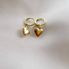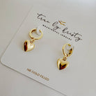14k gold filled dainty heart charms dangle from huggie style hoops. Lightweight. 15mm hoops + 10mm heart charms Gold filled hoops Lever back closure Lead & nickel free Hypoallergenic Handmade Includes 100% organic cotton jewelry pouch
