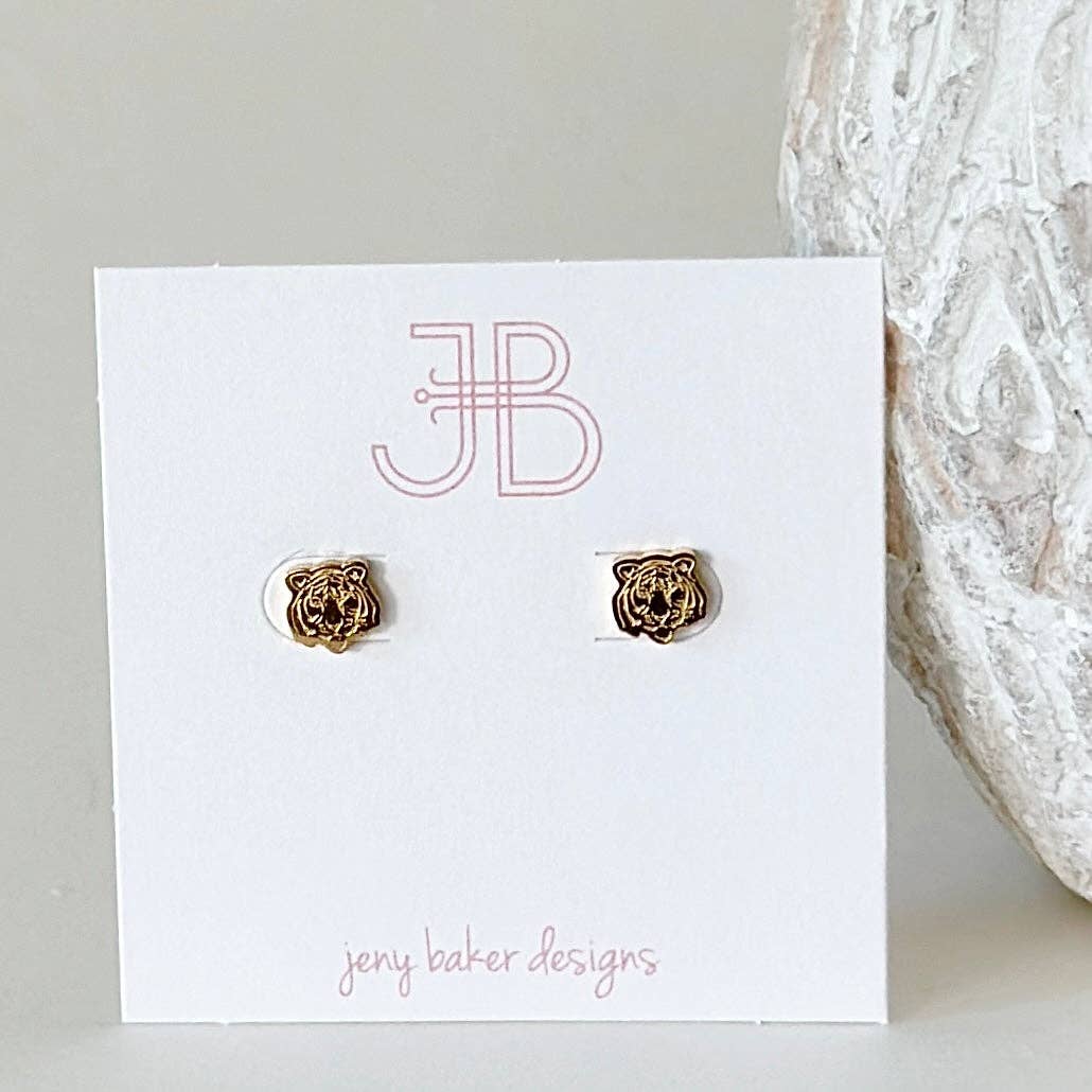 * Gold stainless steel post earrings, in the shape of a tiger's head