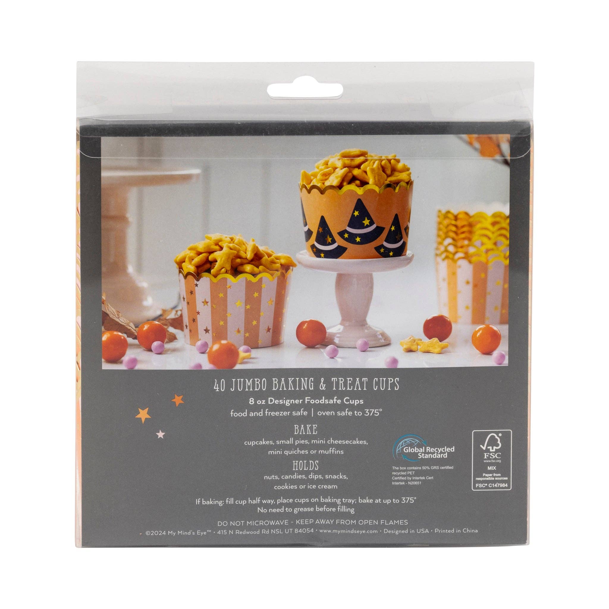 Step up your Halloween party game with these JUMBO foil baking cups featuring witch hats and stars. These 8 oz cups are perfect for all your spooky treats. You get 40 JUMBO baking cups in each box set. 20 of 2 coordinating designs.