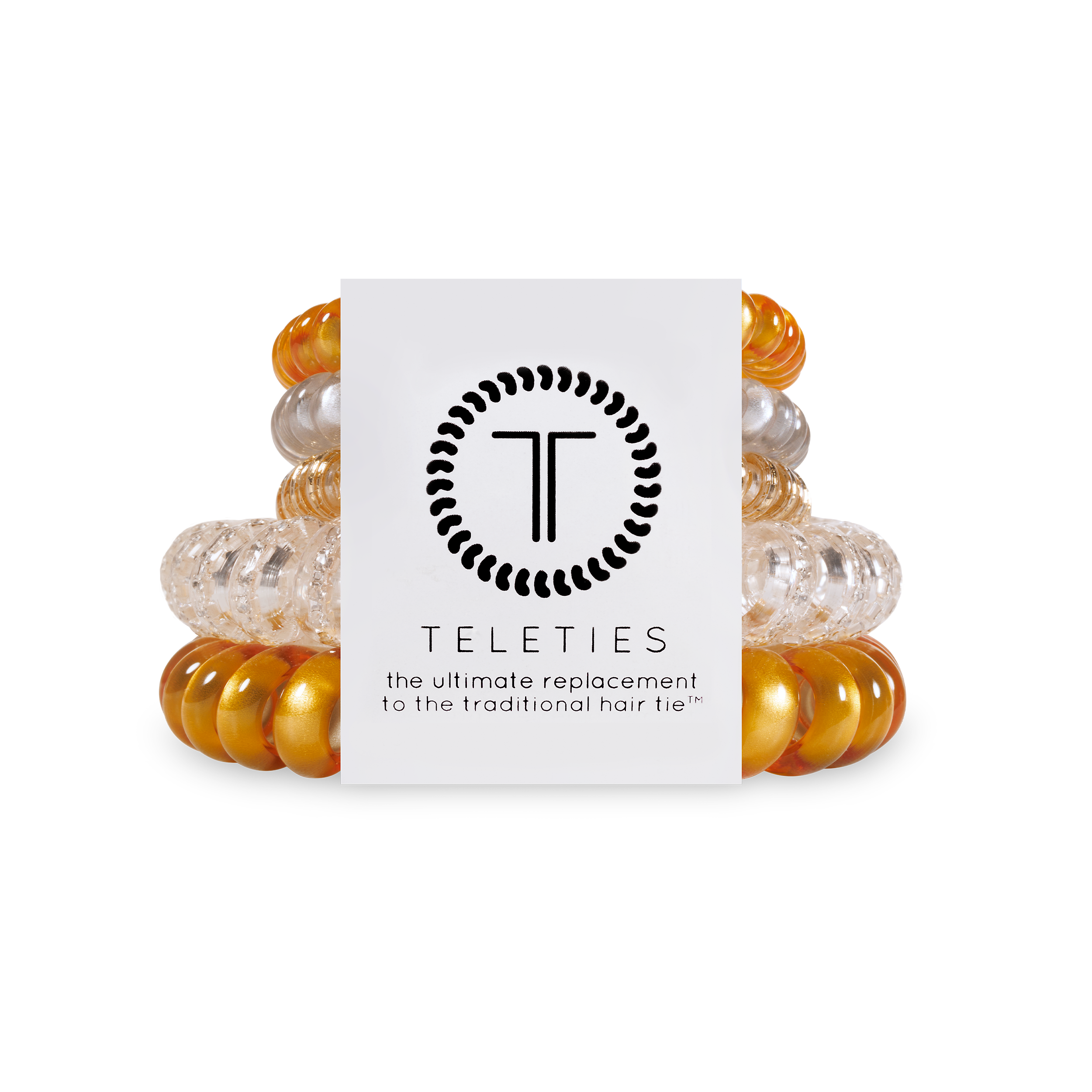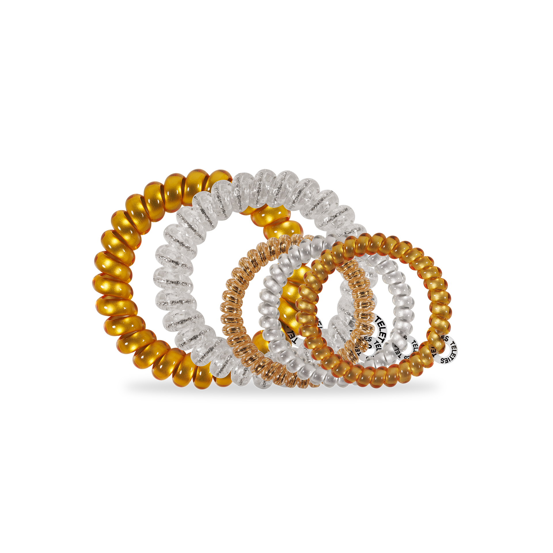 This pack features a range of shimmering gold and silver, offering the perfect combination of glam, comfort, and ease. Key Features: Glamorous Variety: Each hair tie in the pack boasts a shimmering, eye-catching design, adding sparkle and elegance to any look. Comfort & Security: These hair ties provide a gentle yet firm grip, keeping your hair in place no matter how fun the celebrations get. Exceptional Durability: Made with long-lasting materials, these hair ties are designed to be your go-to accessories for years to come. This five pack includes 3 smalls and 2 larges.