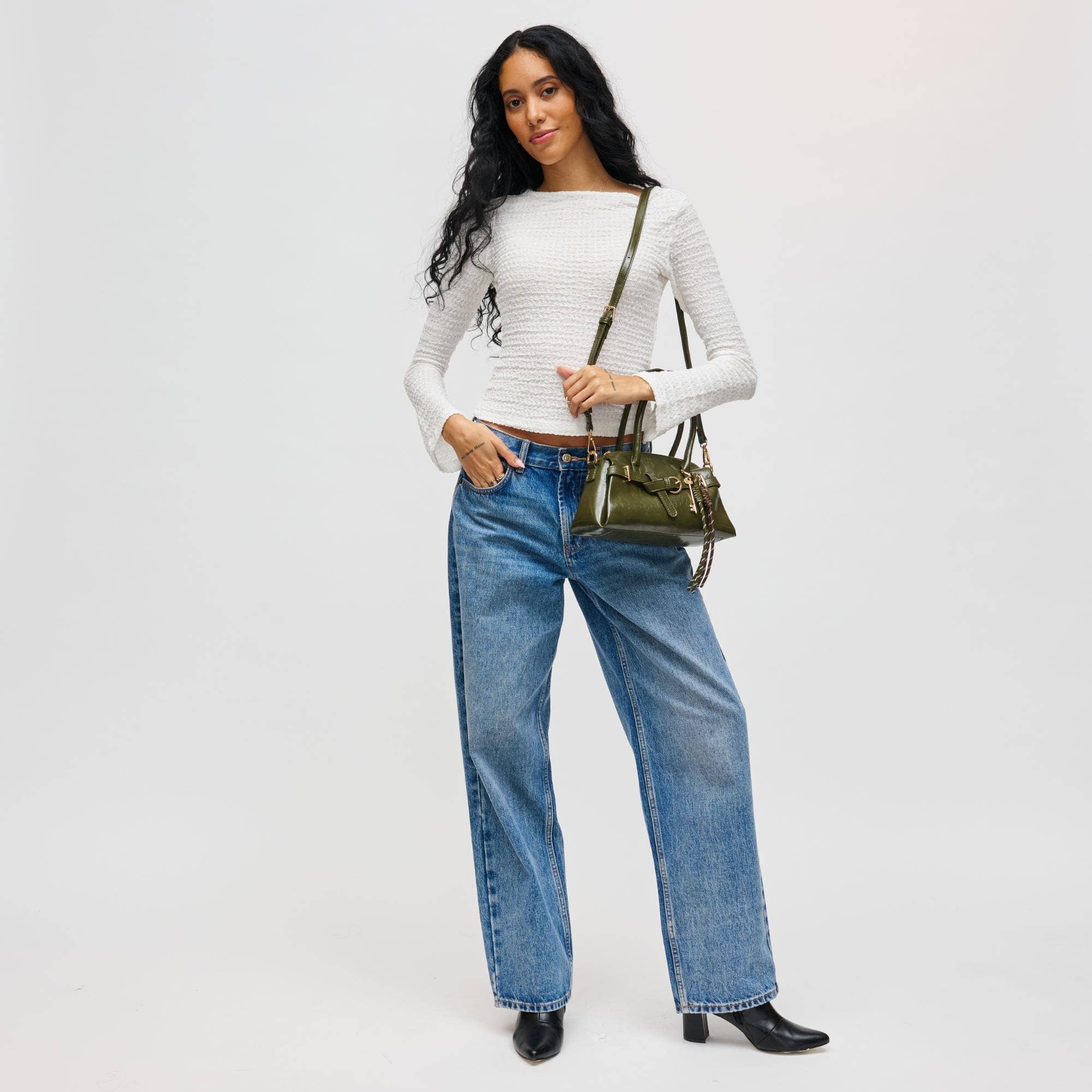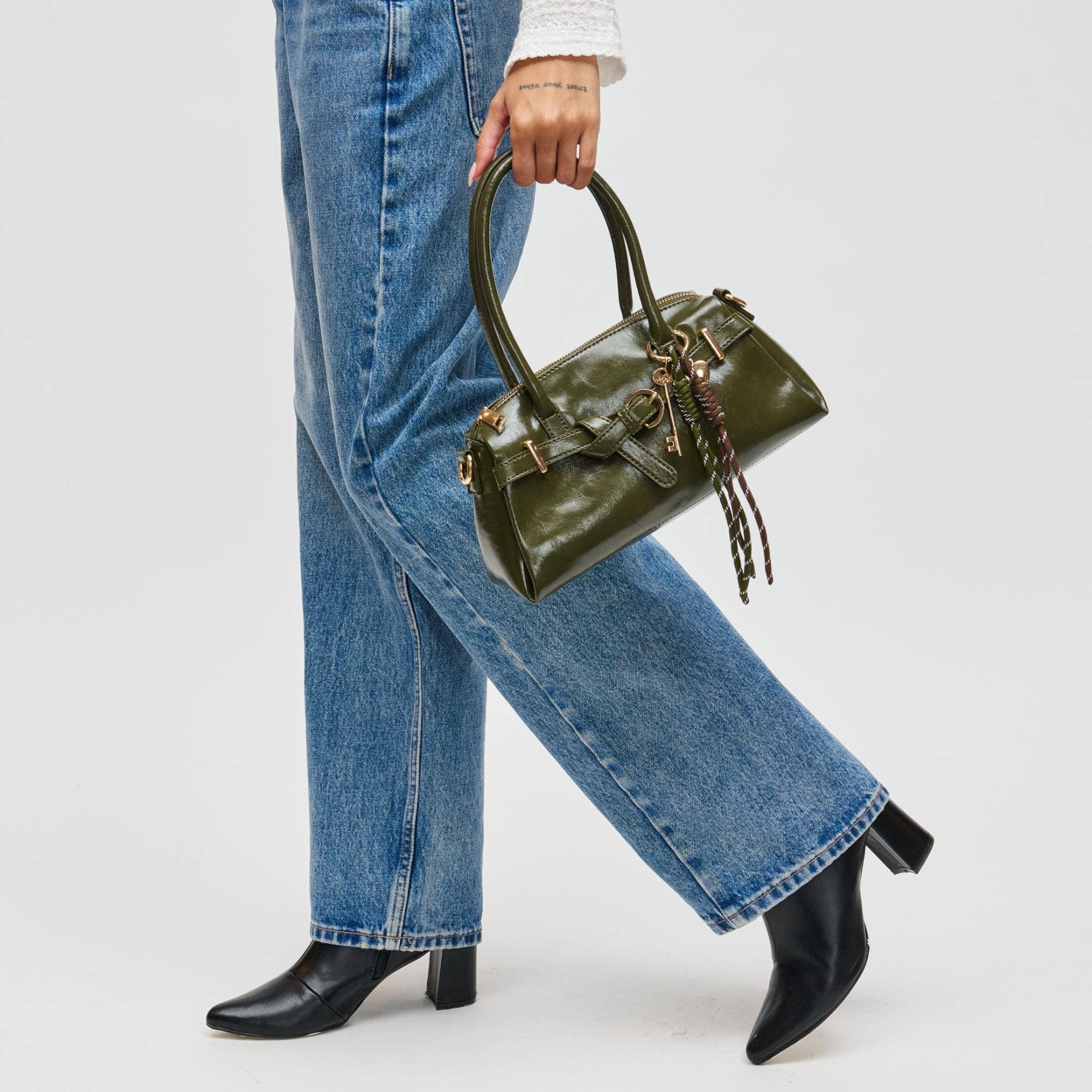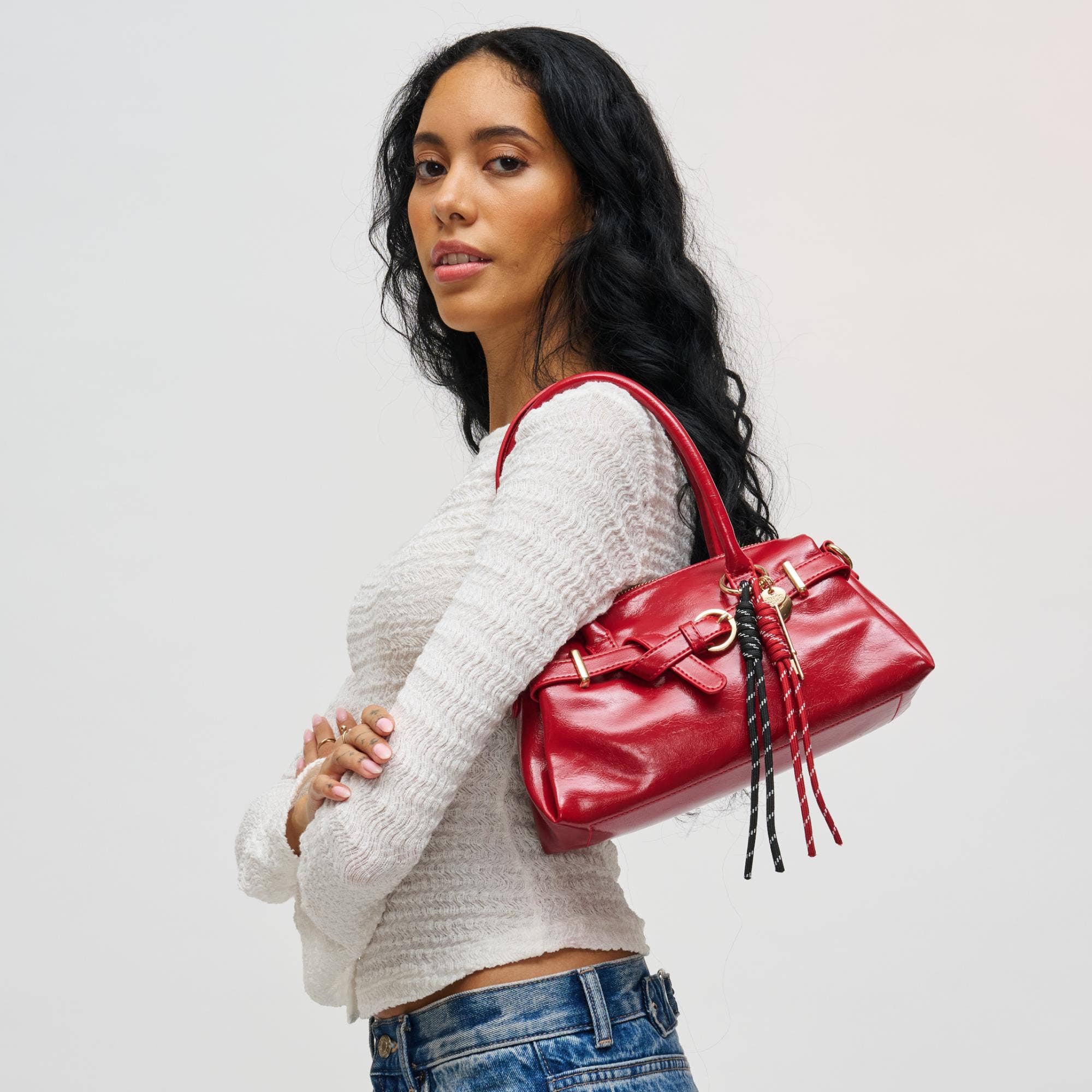 *Item Type: Crossbody *Material: Vegan Leather *Closure: Zipper *Exterior Details: Adjustable/Detachable Shoulder Strap, Gold Hardware, Key Charm, Belted Detail, Dual Shoulder Straps *Interior Details: Printed Fabric Lined, 1 Zip Pocket, 1 Slip Pocket
