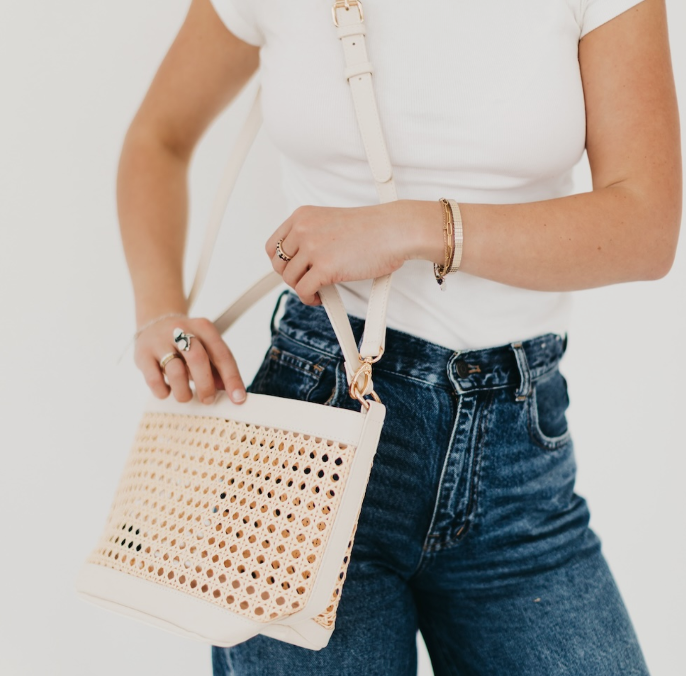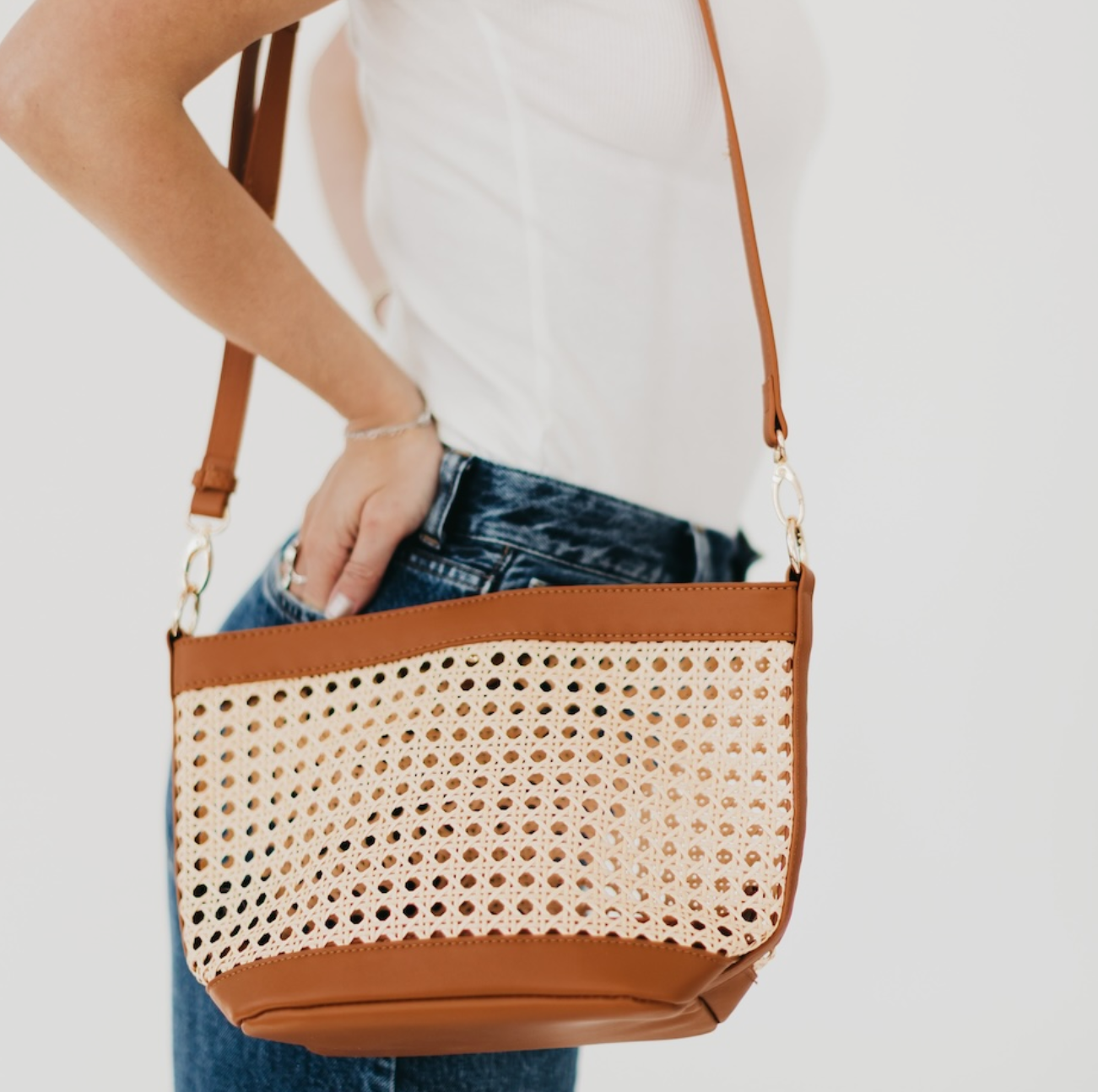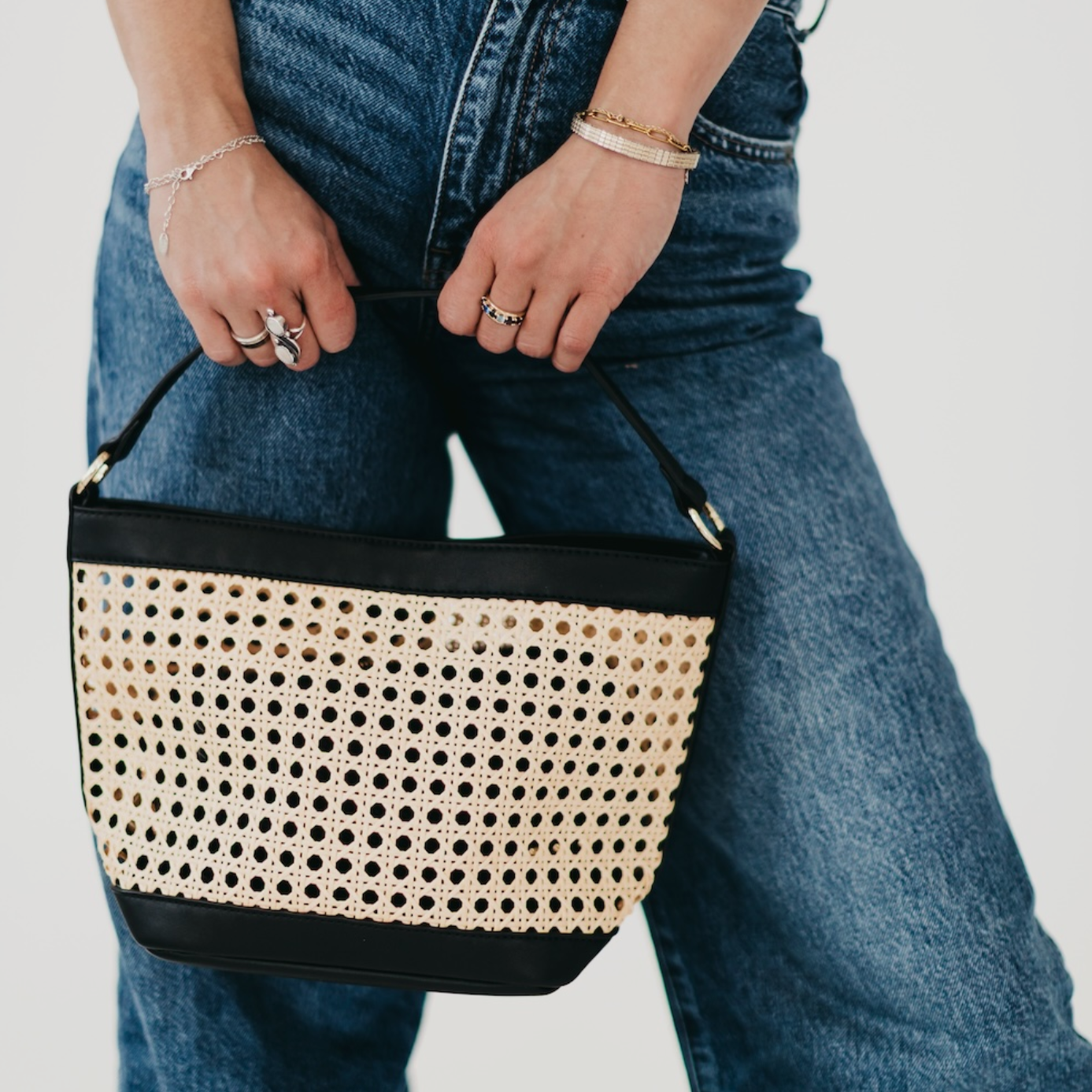 Meet our Bryce Woven Bucket Bag! This bag features woven material, vegan leather detailing, and lots of interior space. Our Bryce Woven Bucket Bag will elevate all your summer look!